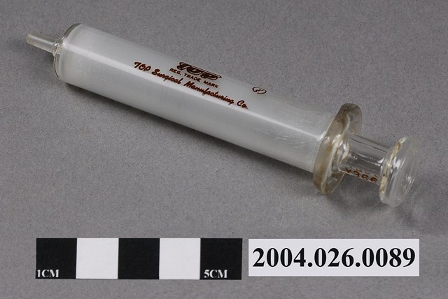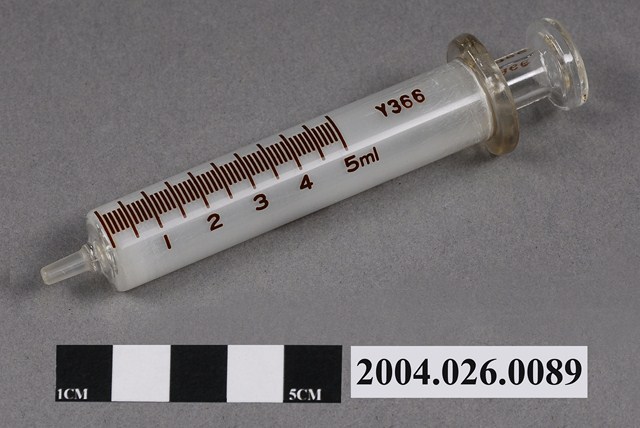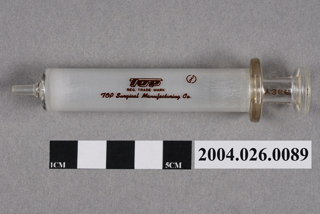 本物件為針筒5c.c.。針筒為透明無色,共有50個刻度,刻度上標有1、2、3、4和5之數字與ml字樣。針筒還印有Y366字樣以及TOP註冊商標與製造商。