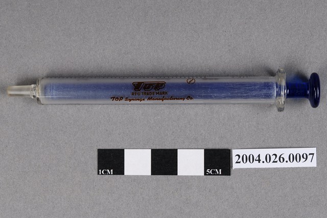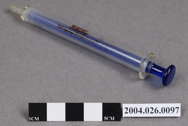 本物件為外白內藍針筒2c.c.。針筒共有40個刻度,刻度上標有1/2、1、1-1/2和2之數字與cc字樣。針筒還印有X30以及TOP註冊商標與製造商。