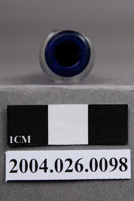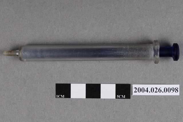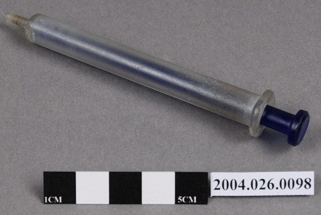 本物件為外白內藍針筒2c.c.,玻璃製。針筒刻度磨損嚴重,亦無法判斷數字。