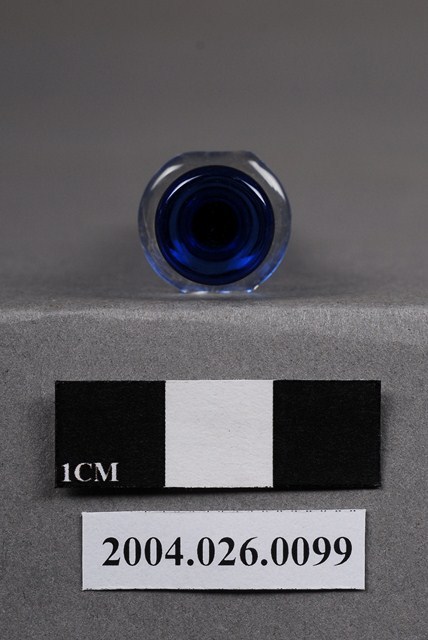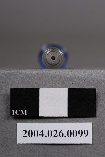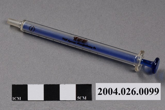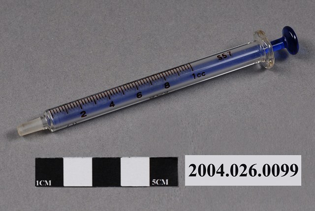 本物件為TOP 1 C.C.藍白色玻璃針筒。針筒共有50個刻度,刻度上標有2、4、6、8和1之數字與cc字樣。針筒還印有S57以及TOP註冊商標與製造商。