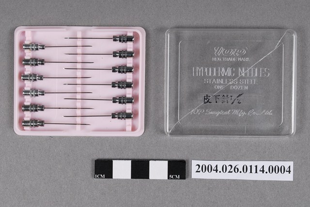 本物件為皮下針一盒。盒蓋文字為凸起字樣,盒身為粉紅色。盒蓋文字有TOP、HYPODERMIC NEEDLES、 STAINLESS STEEL、皮下用1/2等。一盒內有12支針,每支針可分為針頭與細長針管。