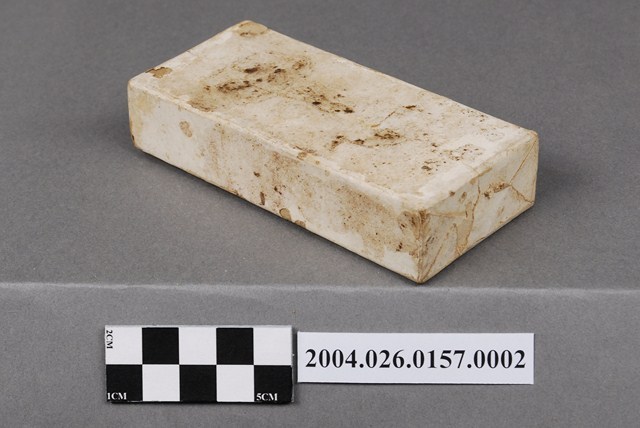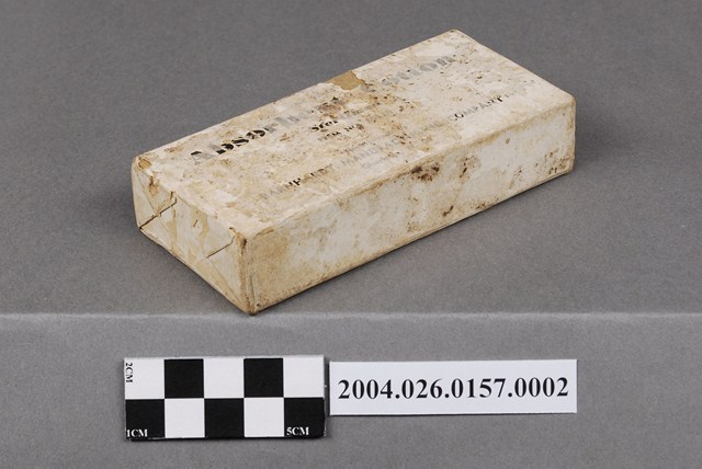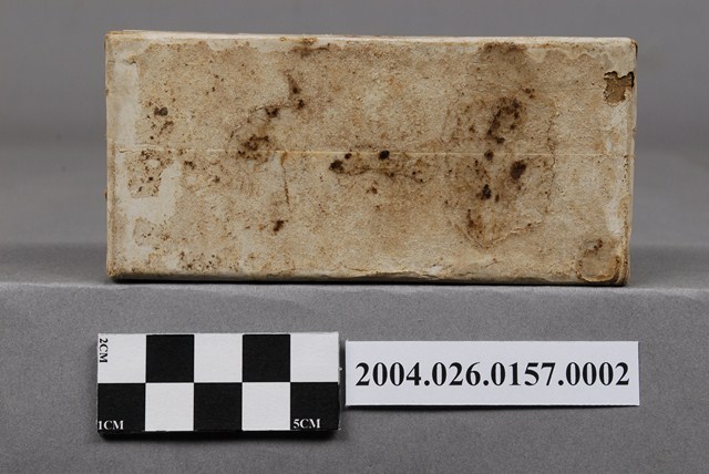 本物件為棉花。包裝成長方體。包裝上僅有一面有字樣,印有ONE OUNCE、Absorbent Cotton、Sterilizen、ITEM NO. 20130、Manufactured By BARNHARDT MANUFACTURING COMPANY和Charlotte N. C.。