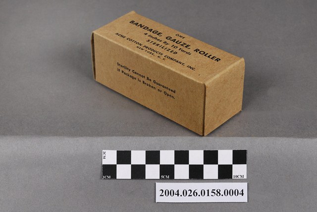 本物件為繃帶之盒子。盒子為長方體,顏色為牛皮紙色。盒面印有BANDAGE、GAUZE、ROLLER、4 Inches By 10 Yards、STERILIZED等字樣,以及製造商資訊。
