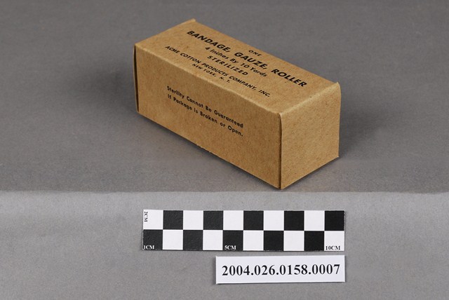 本物件為繃帶之盒子。盒子為長方體,顏色為牛皮紙色。盒面印有BANDAGE、GAUZE、ROLLER、4 Inches By 10 Yards、STERILIZED等字樣,以及製造商資訊。