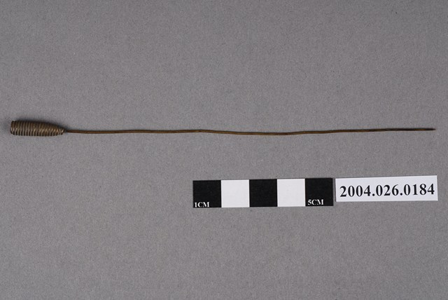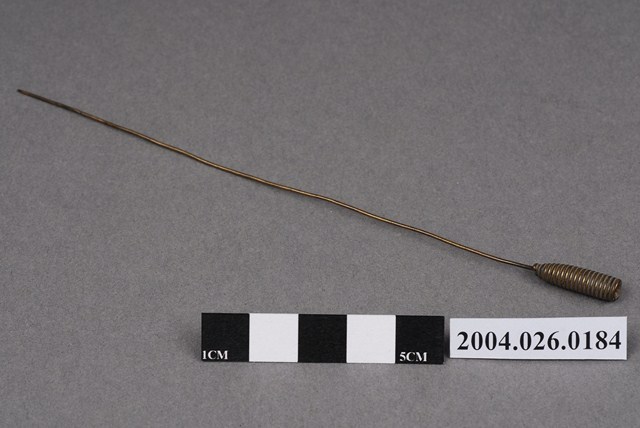 本物件為捲棉棒。由螺旋紋蘿蔔型體的頭與尾端鈍頭的細長棒狀物組成,似金屬材質。棉花可捲繞在棒狀物尾部使用。