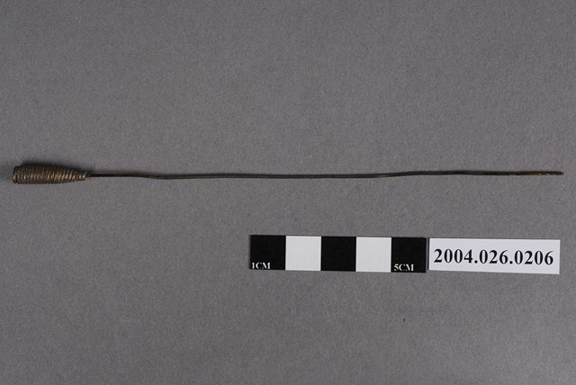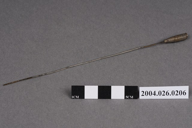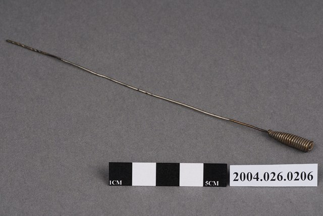 本物件為捲棉棒。由螺旋紋蘿蔔型體的頭與尾端鈍頭的細長棒狀物組成,似金屬材質。棉花可捲繞在棒狀物尾部使用。棒狀尾端有螺旋。