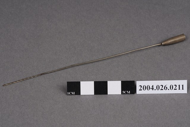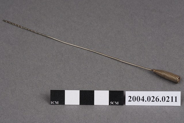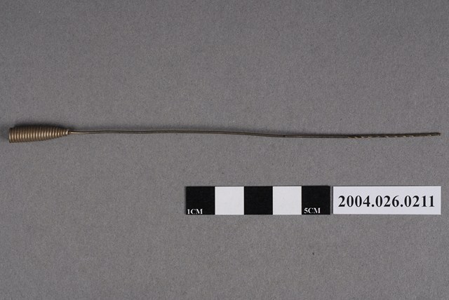 本物件為捲棉棒。由螺旋紋蘿蔔型體的頭與尾端鈍頭的細長棒狀物組成,似金屬材質。棉花可捲繞在棒狀物尾部使用。棒狀尾端有螺旋。