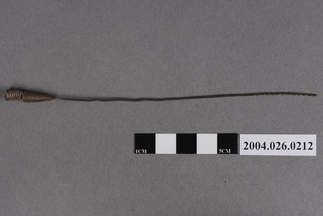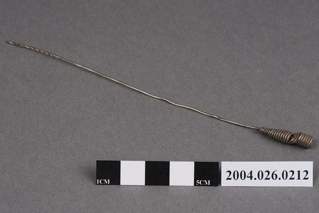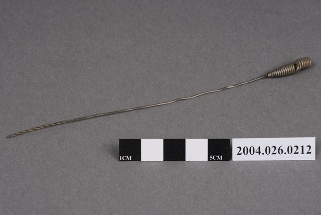 本物件為捲棉棒。由螺旋紋蘿蔔型體的頭與尾端鈍頭的細長棒狀物組成,似金屬材質。棉花可捲繞在棒狀物尾部使用。頭部中間羅旋紋有一圈變型。棒狀尾端有螺旋。