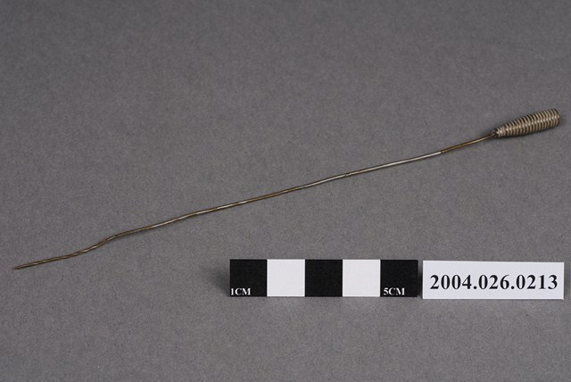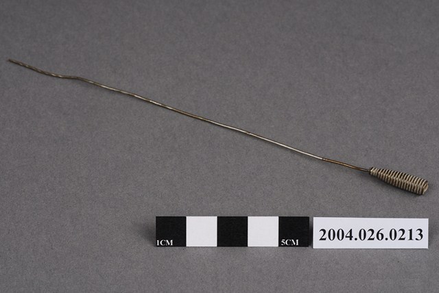 本物件為捲棉棒。由螺旋紋蘿蔔型體的頭與尾端鈍頭的細長棒狀物組成,似金屬材質。棉花可捲繞在棒狀物尾部使用。棒狀尾端有螺旋。