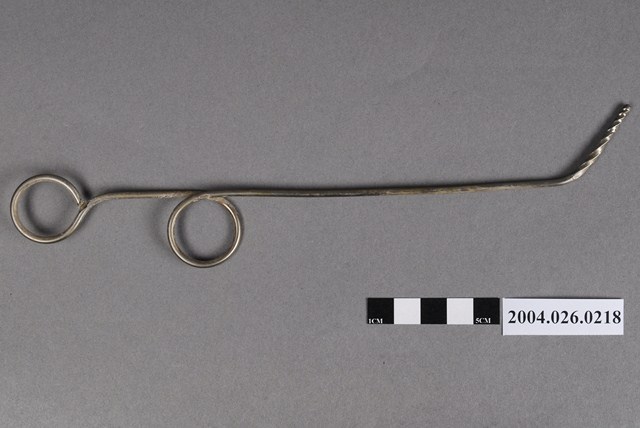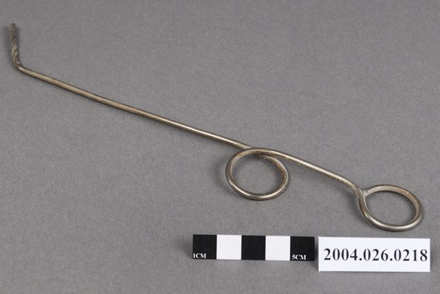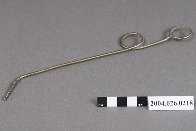 本物件為咽喉用捲棉棒。捲棉棒為金屬製品,柄上有兩個圓圈,供手指穿過拿著。尾端彎曲,有螺旋狀,棉花可捲繞其上使用。