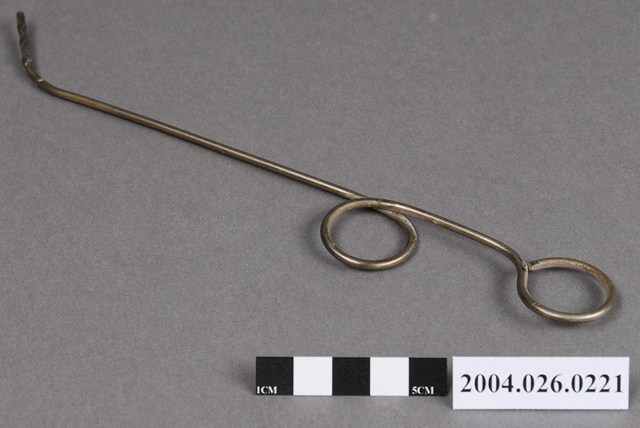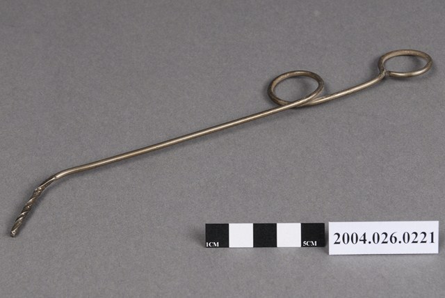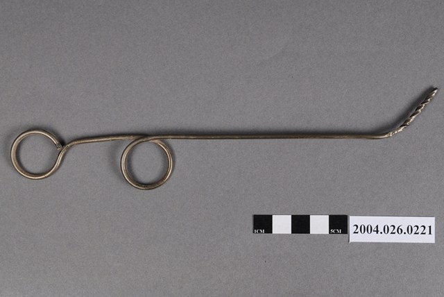 本物件為咽喉用捲棉棒。捲棉棒為金屬製品,柄上有兩個圓圈,供手指穿過拿著。尾端彎曲,有螺旋狀,棉花可捲繞其上使用。