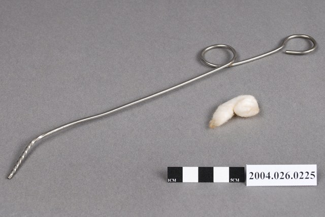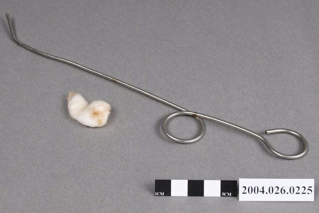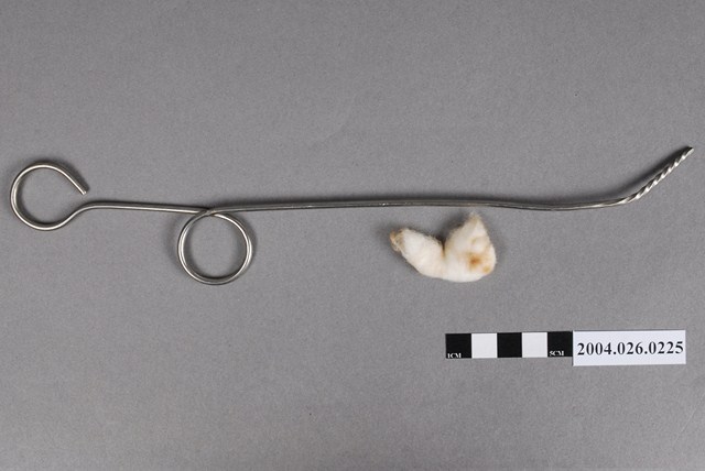 本物件為咽喉用捲棉棒與棉花。捲棉棒為金屬製品,柄上有兩個圓圈,供手指穿過拿著。尾端彎曲,有螺旋狀,棉花可捲繞其上使用。棉花與咽喉用捲棉棒分離。