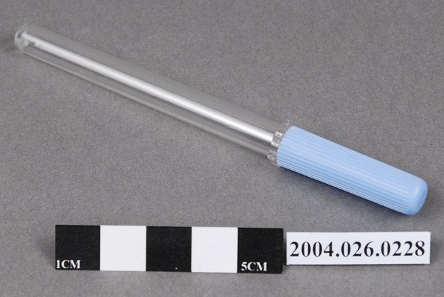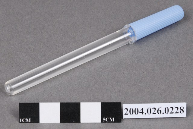 本物件為溫度計塑膠外殼。整體外觀為細長管狀,管身為透明無色,管蓋為淡藍色,有直條紋路。