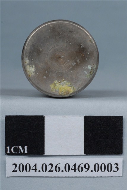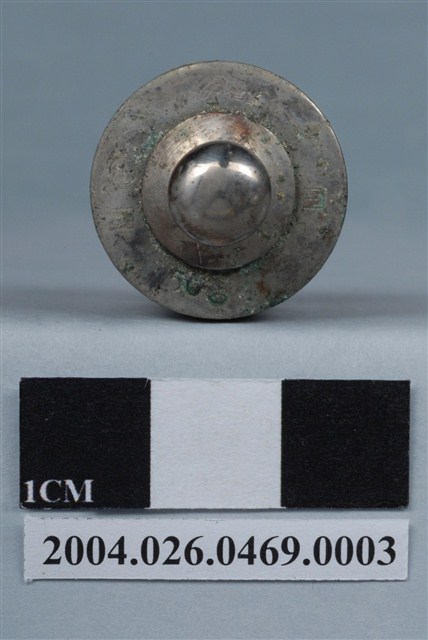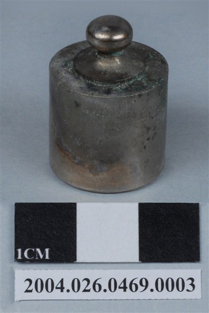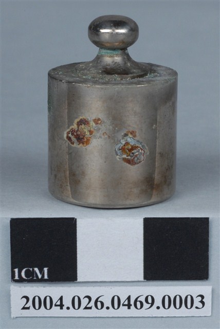 本物件為砝碼。砝碼為金屬製品,底部為圓筒型體,頂部突起成橢圓球狀。圓筒型體處刻有東京、50g等字樣。