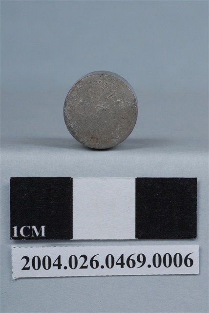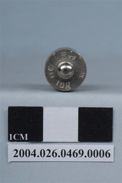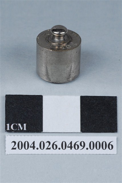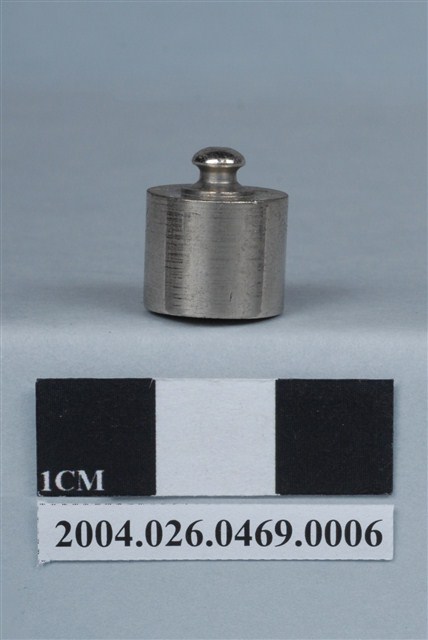 本物件為砝碼。砝碼為金屬製品,底部為圓筒型體,頂部突起成橢圓球狀。圓筒型體處刻有東京、10g等字樣。