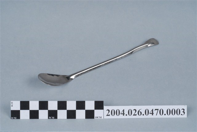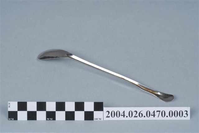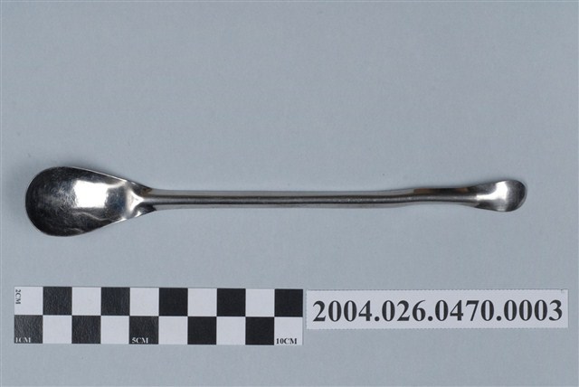 本物件為金屬匙。金屬匙兩頭皆可舀挖研磨後的材料,一頭匙面較大,另一頭較小。