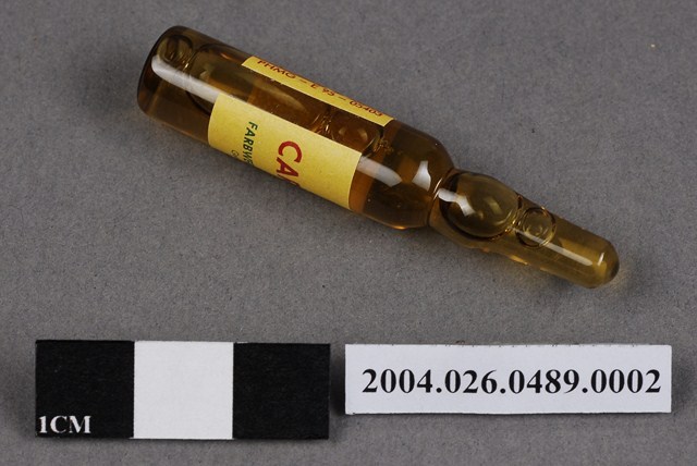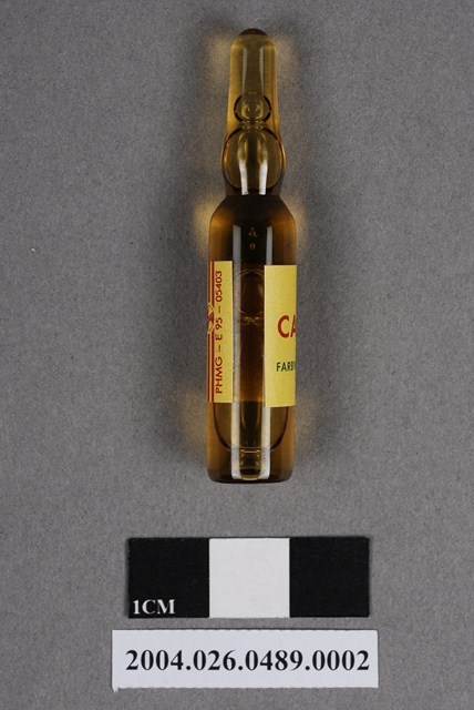 本物件為德國HOECHST製CARNIGEN之藥瓶。藥瓶為一體成形,外觀為茶色,內有液體。藥瓶上貼有標籤,印有CARNIGEN、2 ml等字樣以及製藥廠資訊。