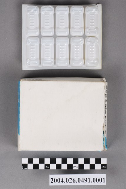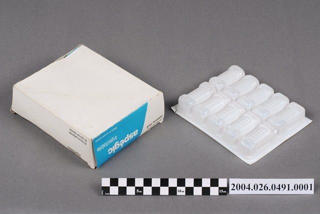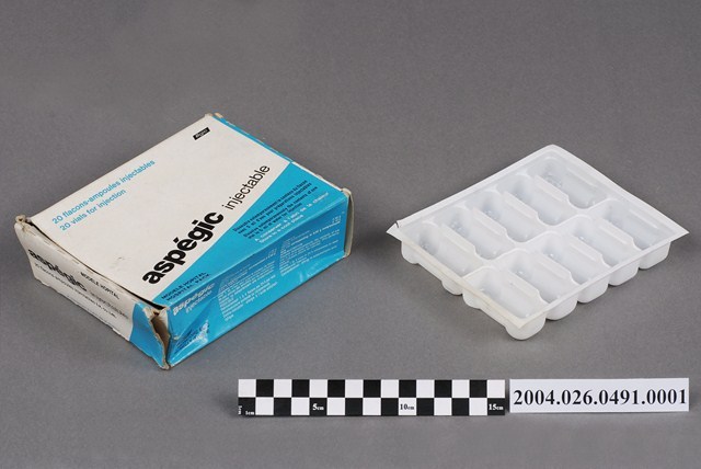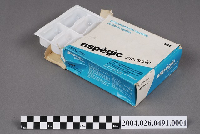 1.本物件為阿斯百吉乾粉注射劑之包裝外盒。包裝外盒為白底加淺藍色長方體紙盒。盒身正面部分,有大字標題黑色印刷字為「aspégic injectable」,左上角有藍色印刷字體「20 flacons-ampoules」、「20 vials for injection」,紙盒內有一個白色塑膠內襯上有10個凹槽,可以承裝10瓶小瓶注射劑。