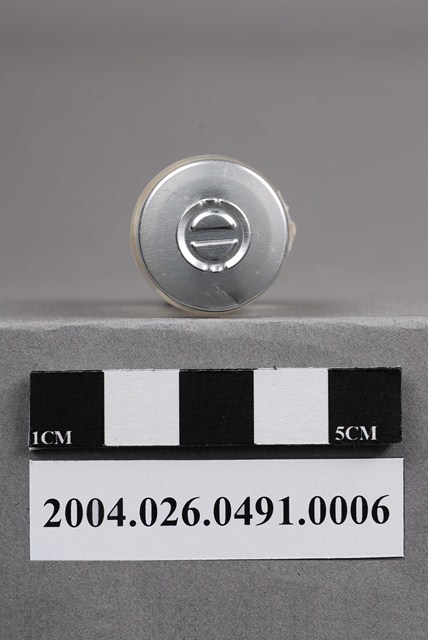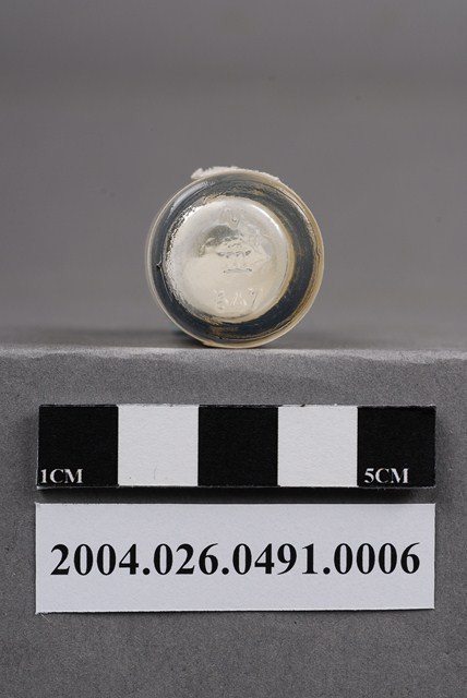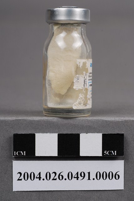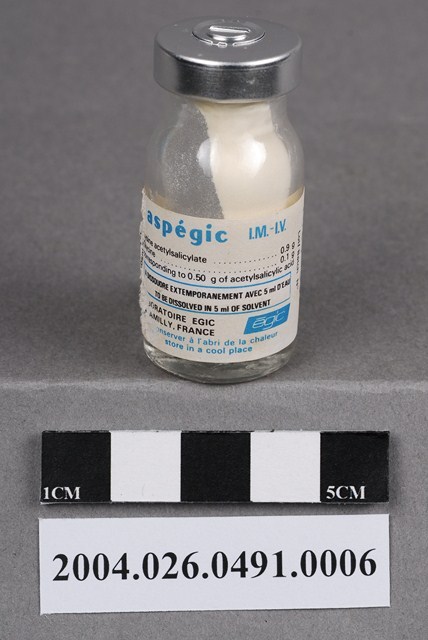 1.本物件為阿斯百吉乾粉注射劑劑瓶。瓶身為透明玻璃材質,瓶內有粉狀物質,有一銀色蓋子,應為金屬材質。瓶身有一品名標籤,標籤上的藥品名稱「aspégic」,以藍色字體印刷,主成分為「Lysine acetylsalicylate」、「glycine」。粗體文字「LABORATOIRE ÉGIC‧45 AMILLY (France)」,顯示此藥劑為法國製造。標籤數字有日期章戳「JUN 84」。2.在衛生福利部食品藥物管理署有英文品名「ASPEGIC INJECTABLE」,中文品名「阿斯百吉注射劑」,有3筆