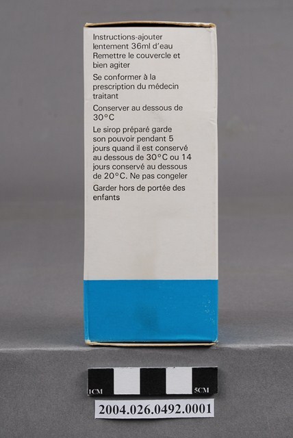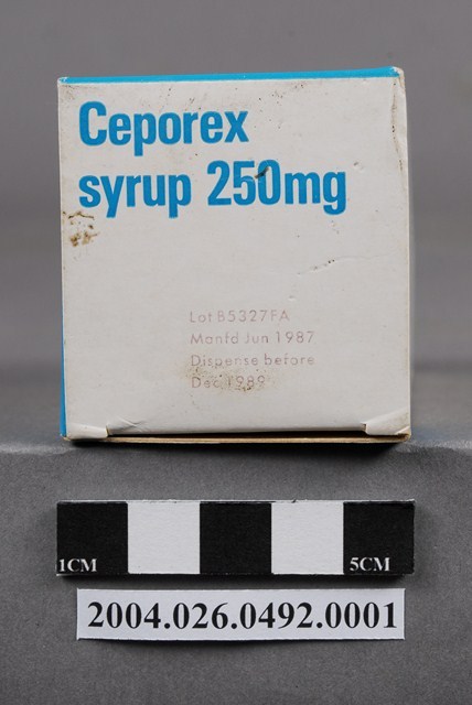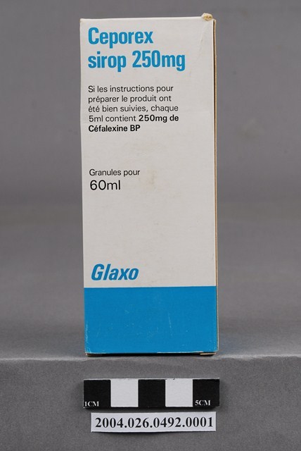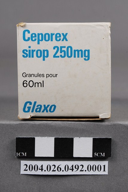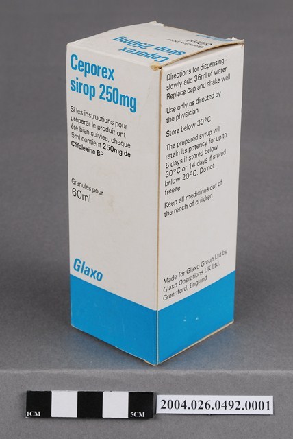 1. 本物件為英國Glaxo製Ceporex糖漿劑包裝紙盒。紙盒為長方體。封面印有Ceporex、syrup 250mg、Granules for 60 ml、Glaxo等字樣以及成分比例說明。另貼有一標籤紙,上印有西保力顆粒、衛署藥輸字第015638號等字樣。側面印有使用說明。