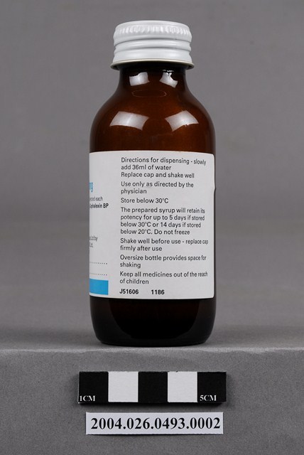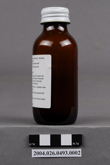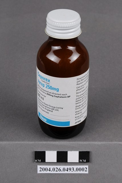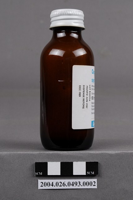 1. 本物件為英國Glaxo製Ceporex糖漿劑之藥瓶。藥瓶為白色金屬蓋和茶色玻璃瓶身。瓶身貼有標籤,印有Ceporex、syrup 250mg、Granules for 60 ml、Glaxo等字樣以及成分比例說明、使用說明。