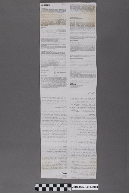 1. 本物件為英國Glaxo製Ceporex糖漿劑說明書。說明書為單張紙,雙面有字,其上有英文和中文等4種語言的說明。 2. 本物件藥瓶標籤上印有MANFD JUN 1987和DISPENSE BEFORE DEC 1989,故此藥物使用期限為西元1987-1989年。