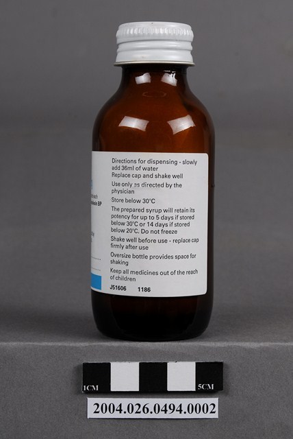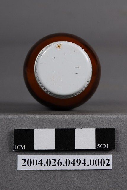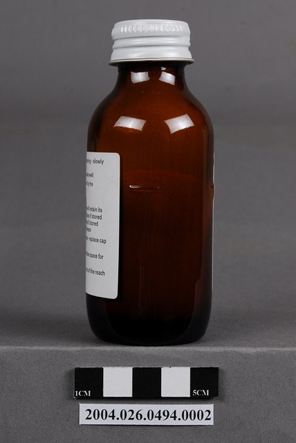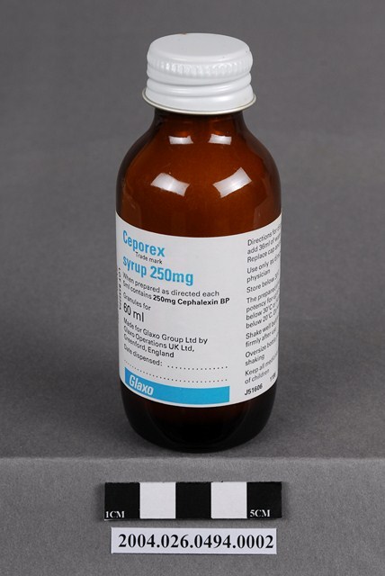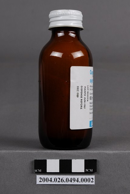 1. 本物件為英國Glaxo製Ceporex糖漿劑之藥瓶。藥瓶為白色金屬蓋和茶色玻璃瓶身。瓶身貼有標籤,印有Ceporex、syrup 250mg、Granules for 60 ml、Glaxo等字樣以及成分比例說明、使用說明。