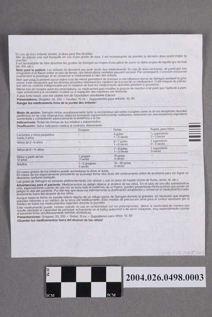 本物件為德國HOMBURG製Selvigon兒童用栓劑說明書。說明書為單張紙,雙面有字。其上印有Selvigon、Antitussivum等字樣,以及成分說明、作用、適應症和用法用量等內容。此為外文說明書,其中一面為英語內容。