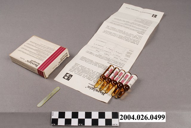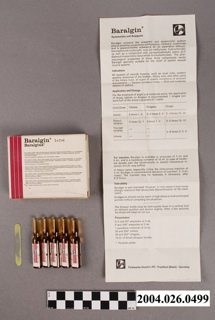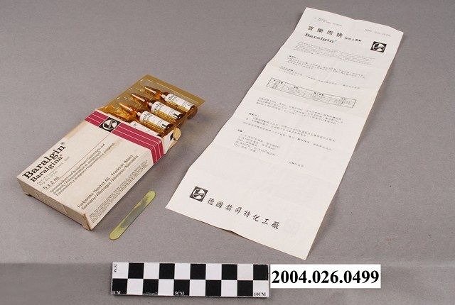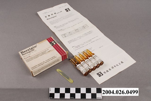 本物件為德國HOECHST製Baralgin解痙止痛劑。共有4種物品,分別是包裝紙盒、藥瓶、小鋸子和說明書。