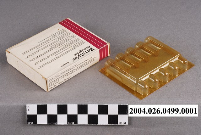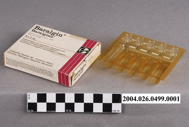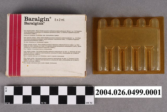 本物件為德國HOECHST製Baralgin解痙止痛劑包裝紙盒。紙盒為白底,其上印有Baralgin、Baralgina、5x2ml、Spasmolytic and analgesic等字樣以及商標。盒中有茶色塑膠容器,有5格,可放置5管藥瓶。