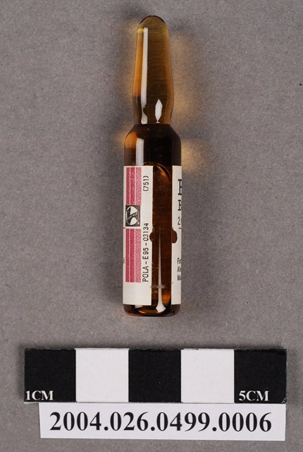 本物件為德國HOECHST製Baralgin解痙止痛劑之藥瓶。藥瓶為一體成形,外觀為茶色,內有液體。藥瓶上貼有標籤,印有Baralgin、Baralgina、2ml等字樣以及製藥廠資訊。