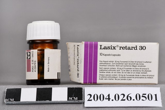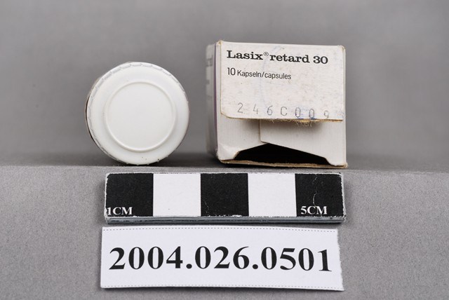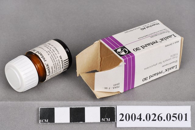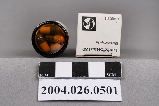 1.本物件為來適泄長效膠囊30公絲。共有2件物品,分別為包裝紙盒與藥瓶。 2.在衛生福利部食品藥物管理署有英文品名「LASIX RETARD 30」,中文品名「來適泄長效膠囊30公絲」,有兩項目,兩項目的登記許可證字號分別為衛署藥輸字第006842號、衛署藥輸字第016250號,兩者許可證目前皆已註銷,前者註銷年分為西元1988年、後者為2006年,劑型為膠囊劑,適應症為適應症為利尿、高血壓。製造廠名稱為德國的「FDE0108000 HOECHST AG」。
