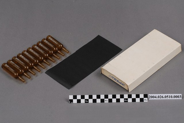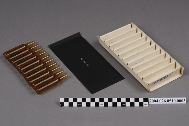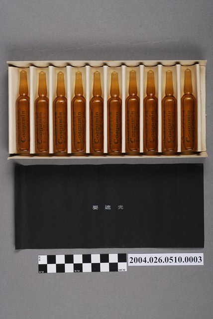本物件為東京エーザイ株式會社出品コアグシソ注射液第一層。第一層共有3種物品,分別為蓋子、盒子和注射液瓶。蓋子為黑色,其上印有要遮光字樣。盒子分成10格,每格可放1瓶注射液。本層共有10瓶注射液,注射液瓶為一體成形,其上有コアグシソ注、Coagumin字樣。