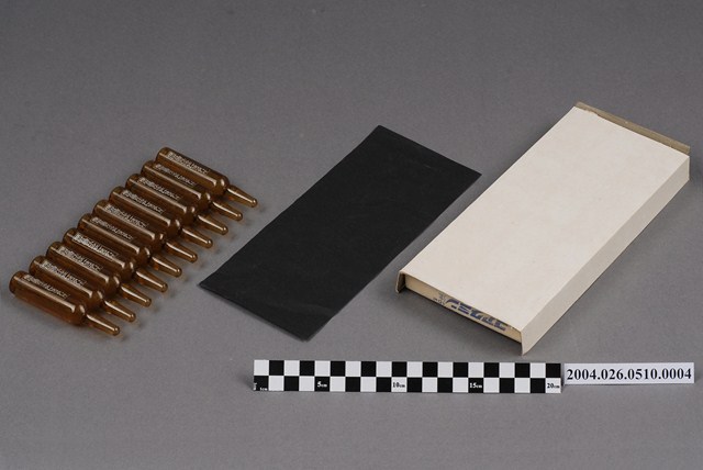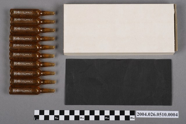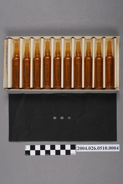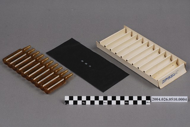 本物件為東京エーザイ株式會社出品コアグシソ注射液第一層。第一層共有3種物品,分別為蓋子、盒子和注射液瓶。蓋子為黑色,其上印有要遮光字樣。盒子分成10格,每格可放1瓶注射液。本層共有10瓶注射液,注射液瓶為一體成形,其上有コアグシソ注、Coagumin字樣。