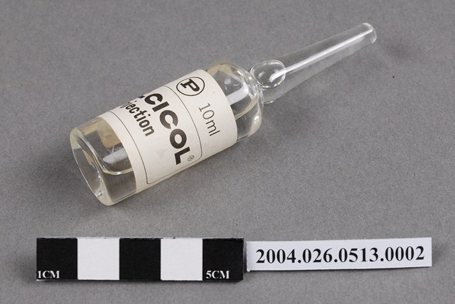 本物件為大日本製藥株式會社出品カルチコール注射液之藥瓶。藥瓶為一體成形,外觀為透明無色,內有透明無色液體。藥瓶上貼有標籤,印有10ml、CALCICOL、Injectioin等字樣。