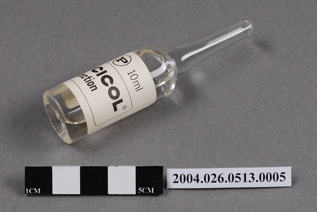 本物件為大日本製藥株式會社出品カルチコール注射液之藥瓶。藥瓶為一體成形,外觀為透明無色,內有透明無色液體。藥瓶上貼有標籤,印有10ml、CALCICOL、Injectioin等字樣。