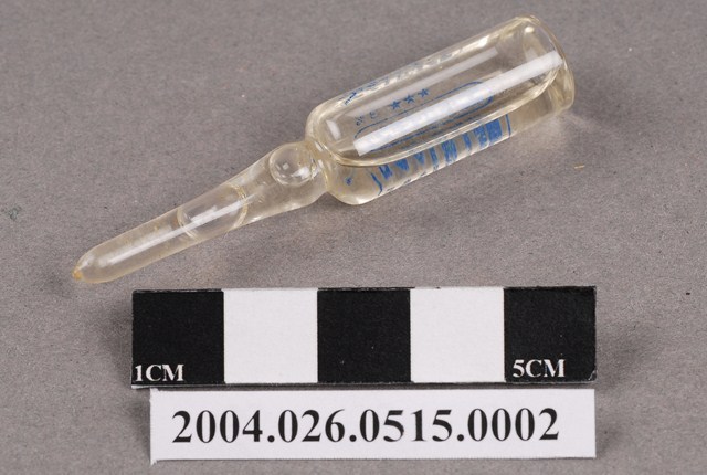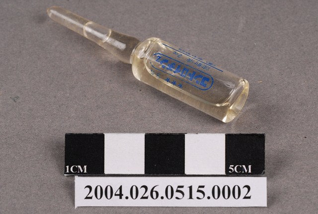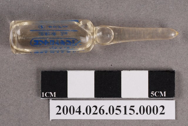 本物件為ゼリア株式會社製コンドロイチンz注射液之藥瓶。藥瓶為一體成形,透明無色,瓶內有透明無色的液體。瓶身印有藍色字體,有コンドロイチンz、注射液、2cc、ゼリア等字樣。