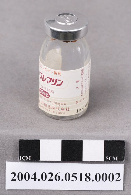 本物件為東洋釀造株式會社製造靜注用プレマリン之藥瓶。瓶蓋為金屬,瓶身為透明無色玻璃。瓶蓋上有TOYO字樣。瓶身貼有標籤,其上印有靜注用プレマリン、結合型エストロゲン製劑、筋注使用可能、20mg等字樣,以及成分說明和製藥廠資訊。