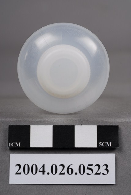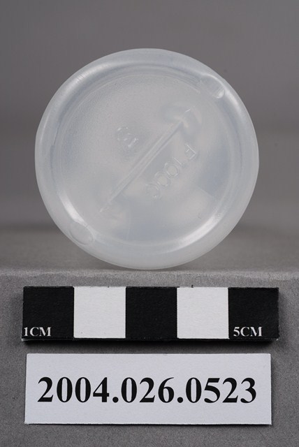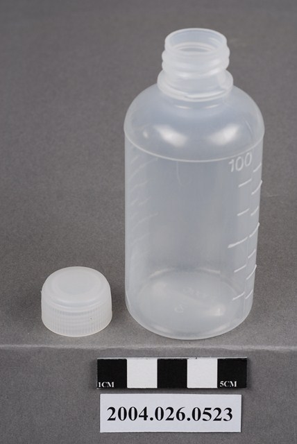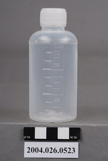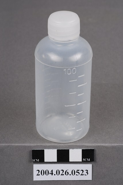 本物件為藥水瓶。瓶身為半透明,有蓋。瓶身兩側有刻度,其中一邊的最上方標有100,故此藥水瓶容量應為100c.c.。其中一邊的刻度較寬,約每16.67c.c.或每12.5c.c.為一刻度,另一邊刻度較密,約每11.11c.c.或約每8.33c.c.為一刻度。底部有F100C和5字樣(刻度換算成c.c.數,是四捨五入取到小數點第二位)。