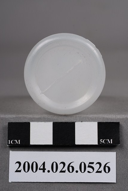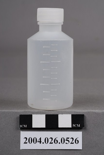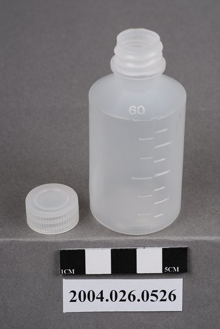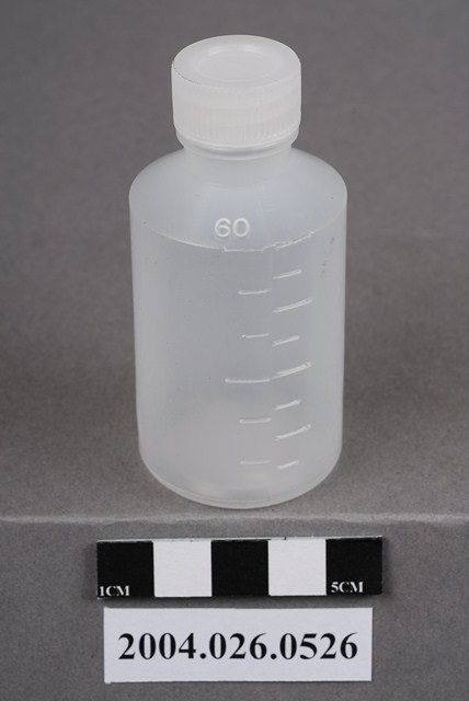 本物件為藥水瓶。瓶身為半透明,有蓋。瓶身兩側有刻度,其中一邊的最上方標有60,故此藥水瓶容量應為60c.c.。其中一邊的刻度較寬,每10c.c.或每7.5c.c.為一刻度,另一邊刻度較密,約每6.67c.c.或每5c.c.為一刻度(刻度換算成c.c.數,是四捨五入取到小數點第二位)。
