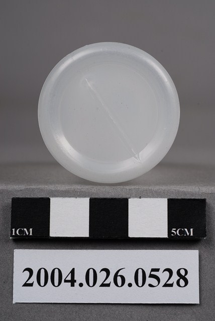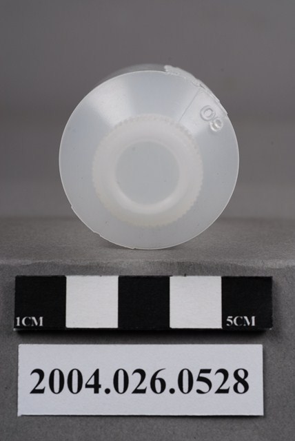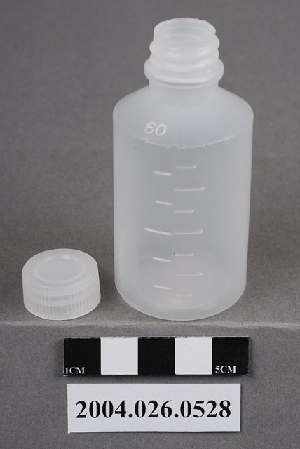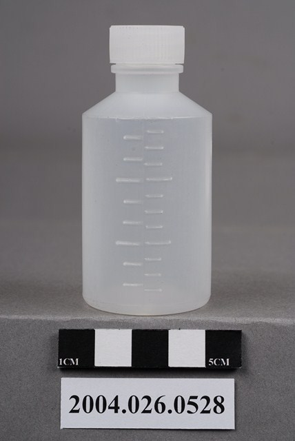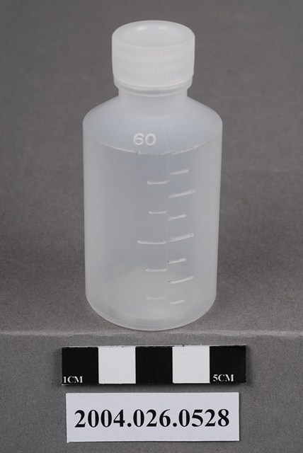 本物件為藥水瓶。瓶身為半透明,有蓋。瓶身兩側有刻度,其中一邊的最上方標有60,故此藥水瓶容量應為60c.c.。其中一邊的刻度較寬,每10c.c.或每7.5c.c.為一刻度,另一邊刻度較密,約每6.67c.c.或每5c.c.為一刻度(刻度換算成c.c.數,是四捨五入取到小數點第二位)。