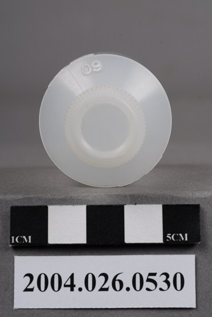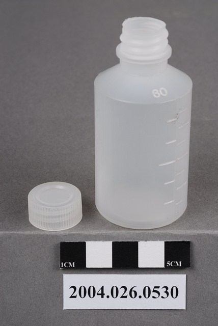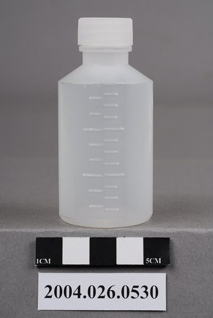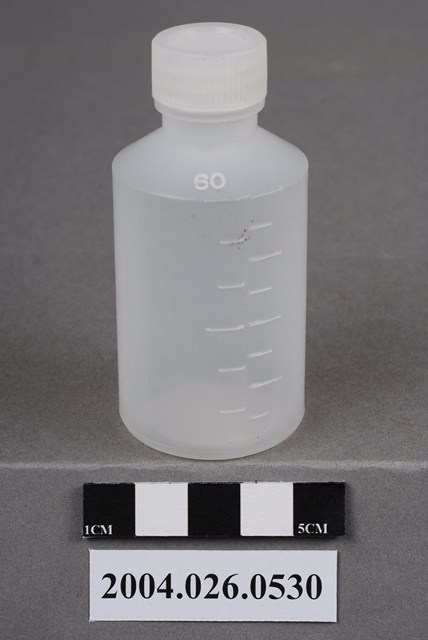 本物件為藥水瓶。瓶身為半透明,有蓋。瓶身兩側有刻度,其中一邊的最上方標有60,故此藥水瓶容量應為60c.c.。其中一邊的刻度較寬,每10c.c.或每7.5c.c.為一刻度,另一邊刻度較密,約每6.67c.c.或每5c.c.為一刻度(刻度換算成c.c.數,是四捨五入取到小數點第二位)。