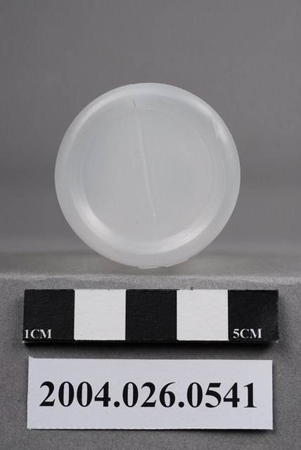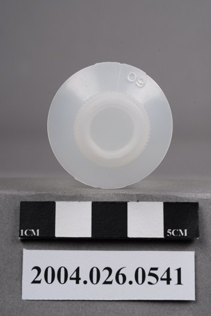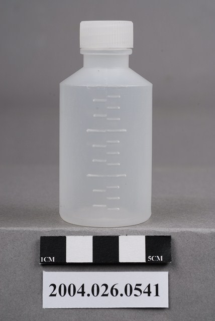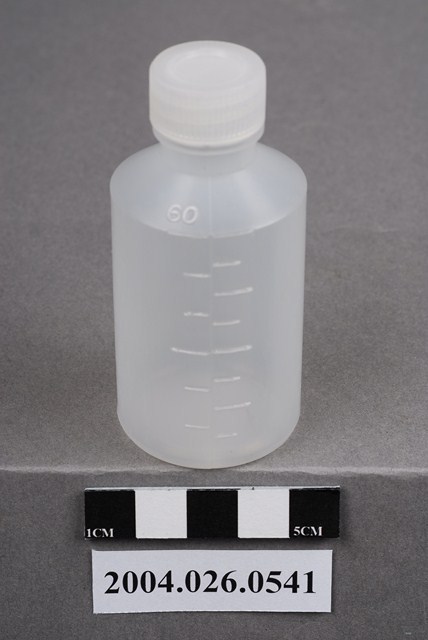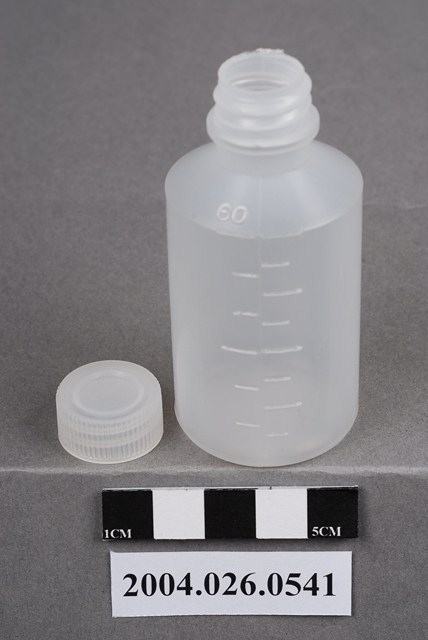 本物件為藥水瓶。瓶身為半透明,有蓋。瓶身兩側有刻度,其中一邊的最上方標有60,故此藥水瓶容量應為60c.c.。其中一邊的刻度較寬,每10c.c.或每7.5c.c.為一刻度,另一邊刻度較密,約每6.67c.c.或每5c.c.為一刻度(刻度換算成c.c.數,是四捨五入取到小數點第二位)。