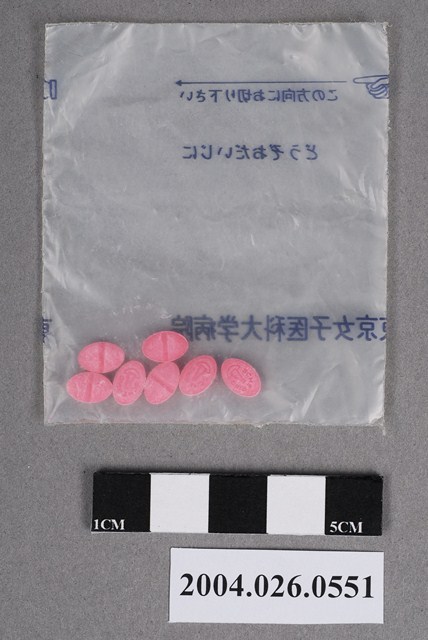 1.本物件為東京女子醫科大學病院藥包。藥包包裝微半透明材質,可見藥丸顏色。藥包上印有この方向にお切リ下さい、どうぞおだいじに、東京女子醫科大學病院字樣。藥丸為粉紅色橢圓形,有7顆完整藥丸。