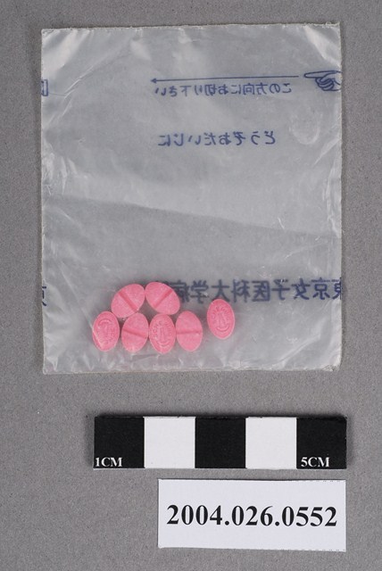 1.本物件為東京女子醫科大學病院藥包。藥包包裝微半透明材質,可見藥丸顏色。藥包上印有この方向にお切リ下さい、どうぞおだいじに、東京女子醫科大學病院字樣。藥丸為粉紅色橢圓形,有7顆完整藥丸。