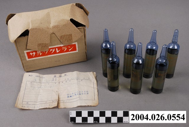 本物件為グレラン製藥株式會社出品サルソグレラン。共有3種物品,分別為包裝紙盒、藥瓶和估價單。本藥為止血藥的一種。