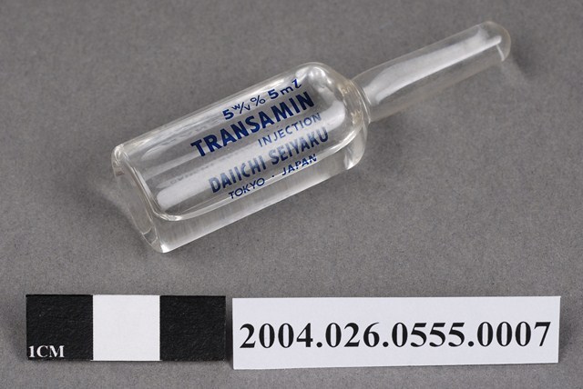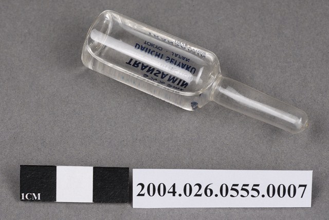 本物件為日本第一製藥株式會社出品TRANSAMIN注射液之藥瓶。藥瓶為一體成形,透明無色。瓶身印有5w/v% 、5ml、TRANSAMIN、INJECTION、DAIICHI SEIYAKU、TOKYO JAPAN字樣。內有透明無色液體。
