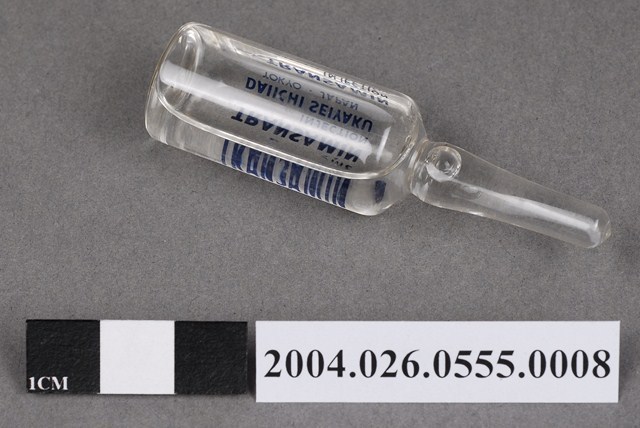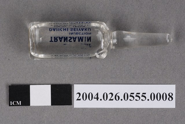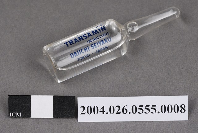 本物件為日本第一製藥株式會社出品TRANSAMIN注射液之藥瓶。藥瓶為一體成形,透明無色。瓶身印有5w/v% 、5ml、TRANSAMIN、INJECTION、DAIICHI SEIYAKU、TOKYO JAPAN字樣。內有透明無色液體。