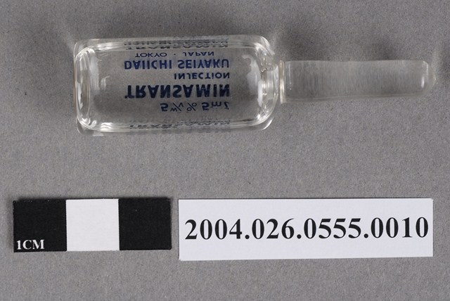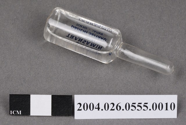 本物件為日本第一製藥株式會社出品TRANSAMIN注射液之藥瓶。藥瓶為一體成形,透明無色。瓶身印有5w/v% 、5ml、TRANSAMIN、INJECTION、DAIICHI SEIYAKU、TOKYO JAPAN字樣。內有透明無色液體。