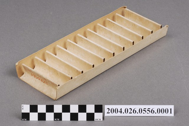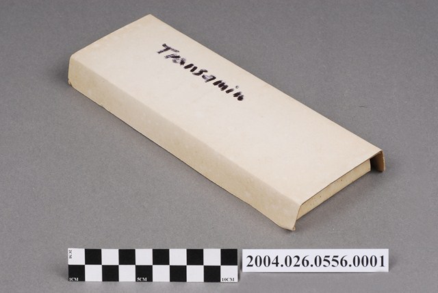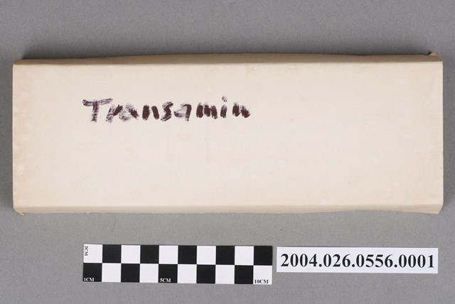 本物件為日本第一製藥株式會社出品TRANSAMIN注射液紙盒。紙盒無蓋,內部空間分成10格。紙盒側邊印有トランサミン注、5mlx10等字樣。紙盒背面有手寫字樣,Transamin。